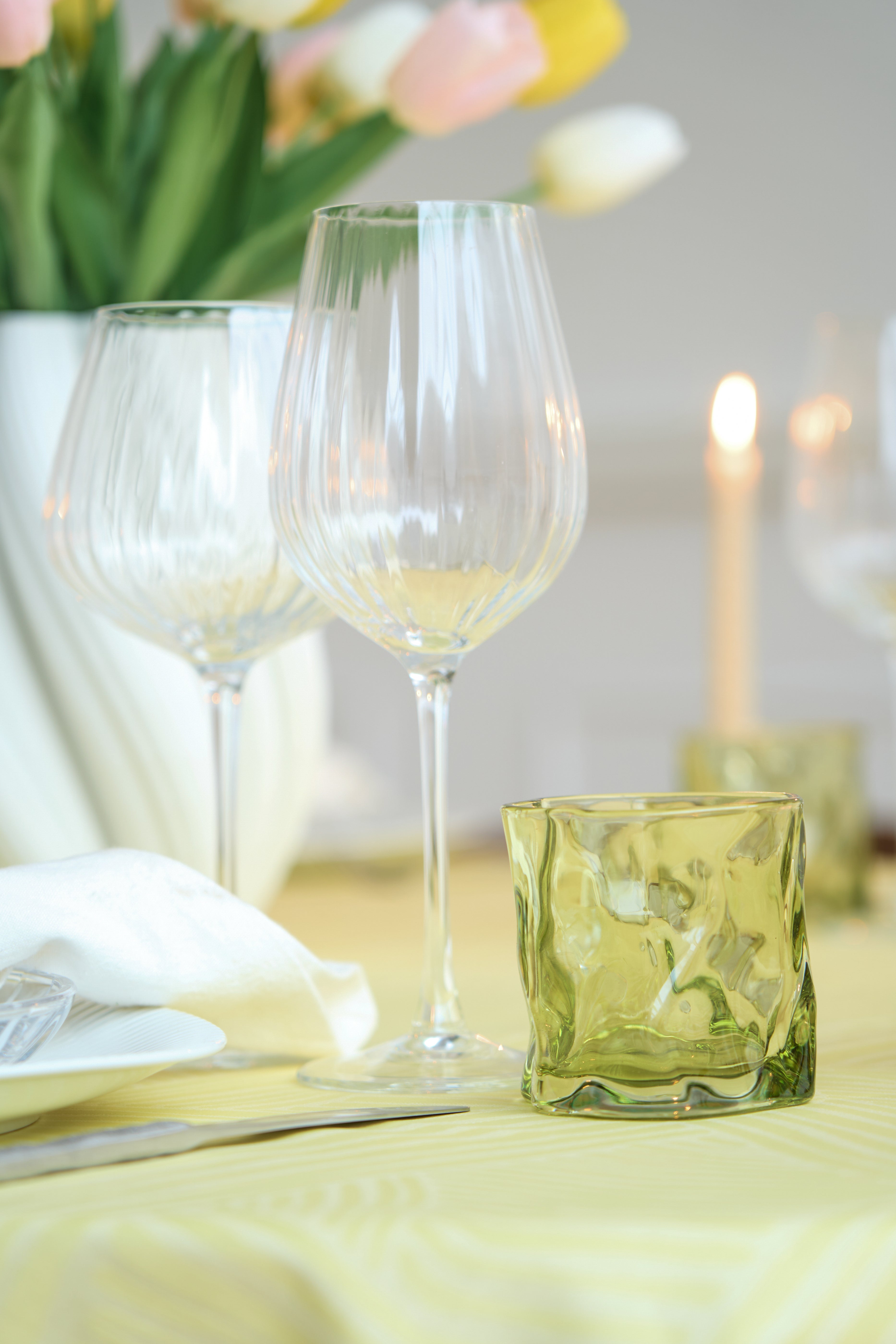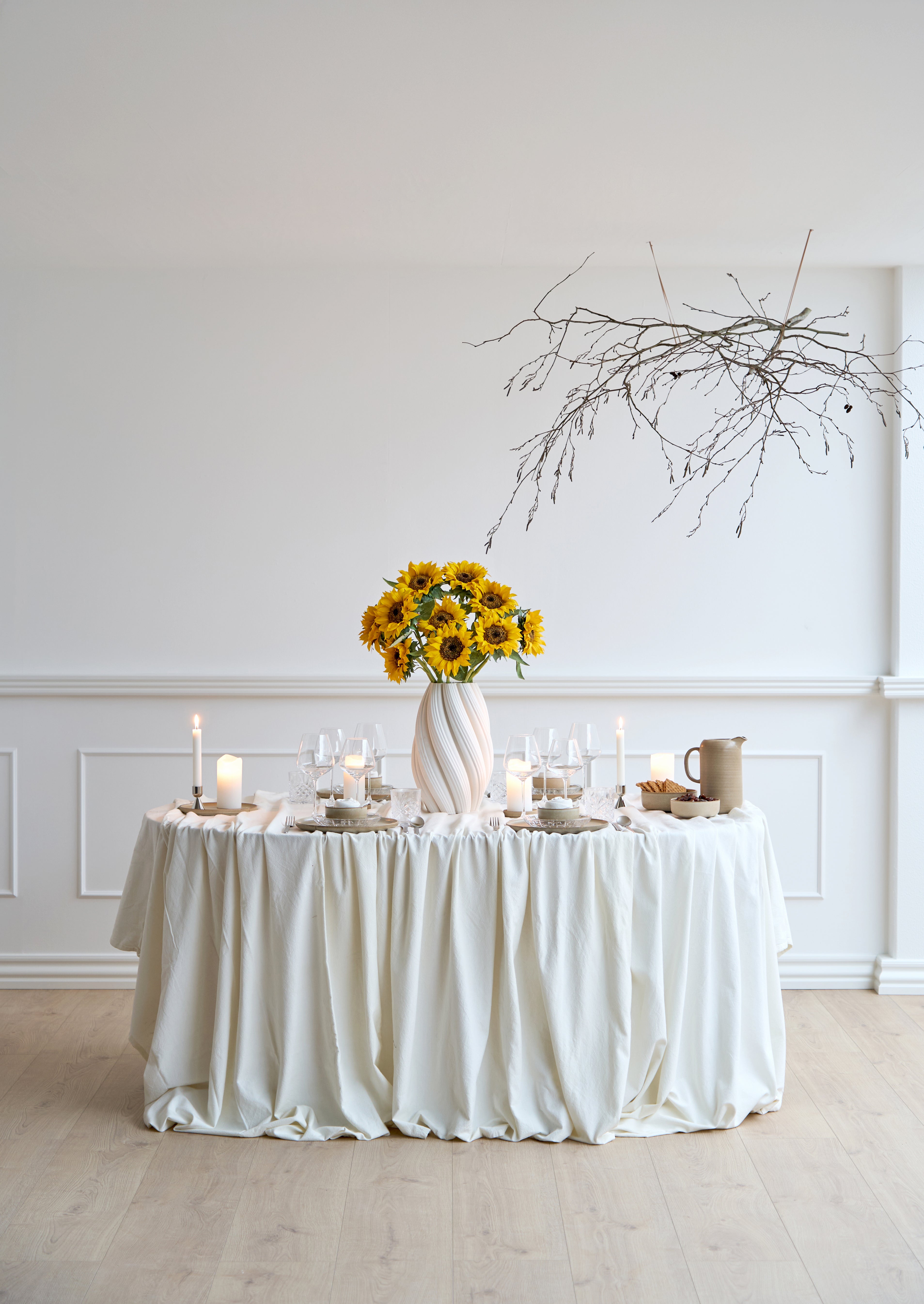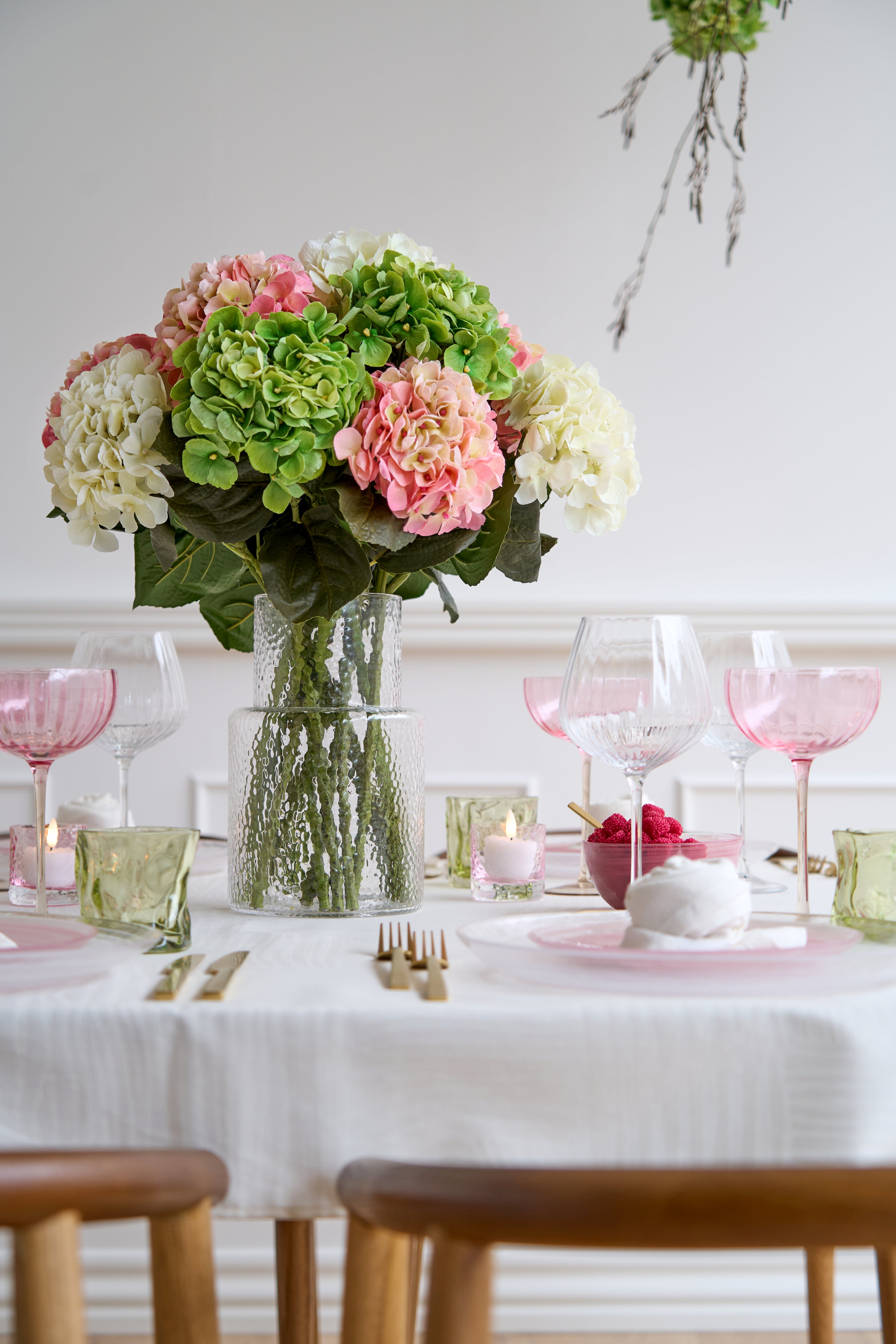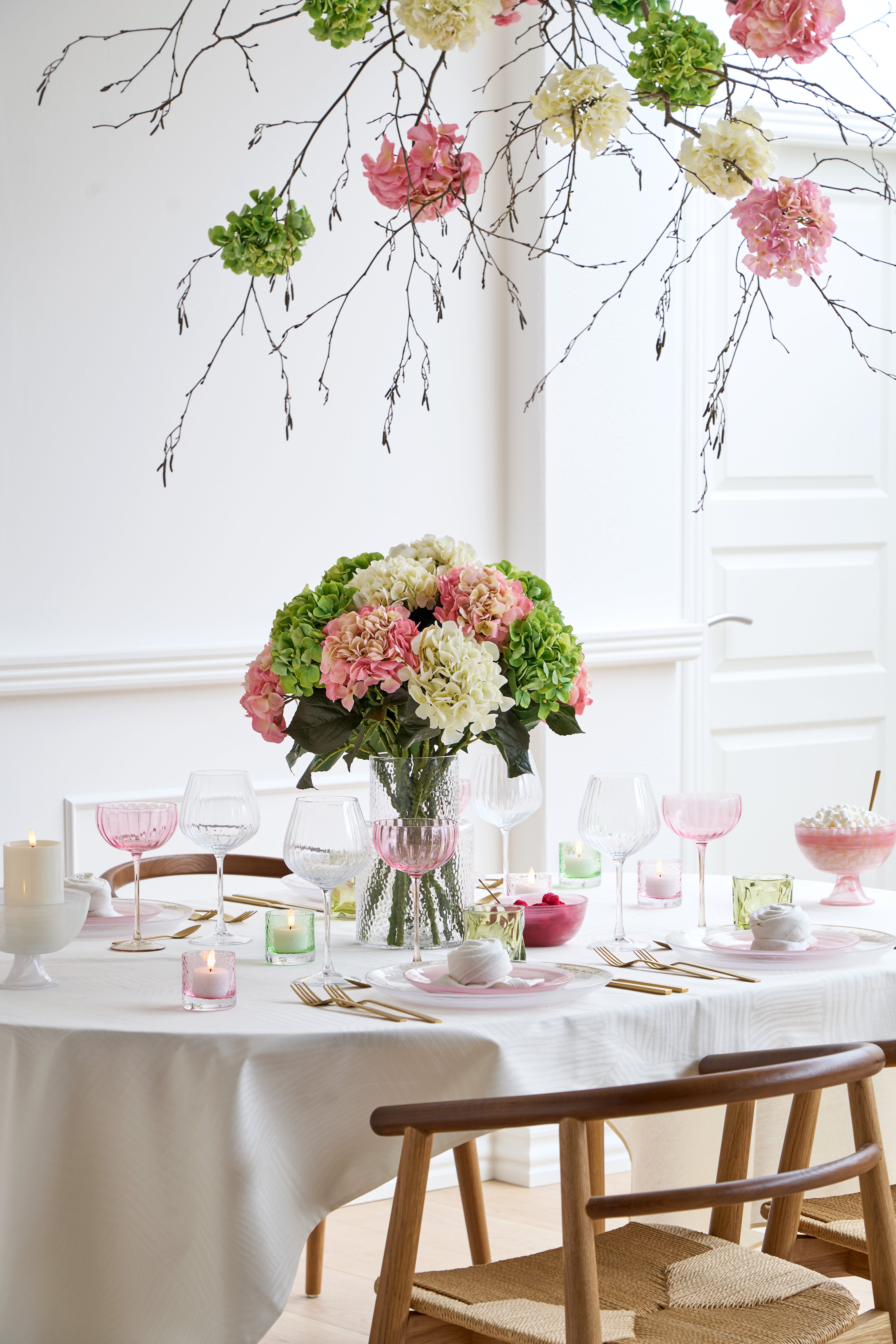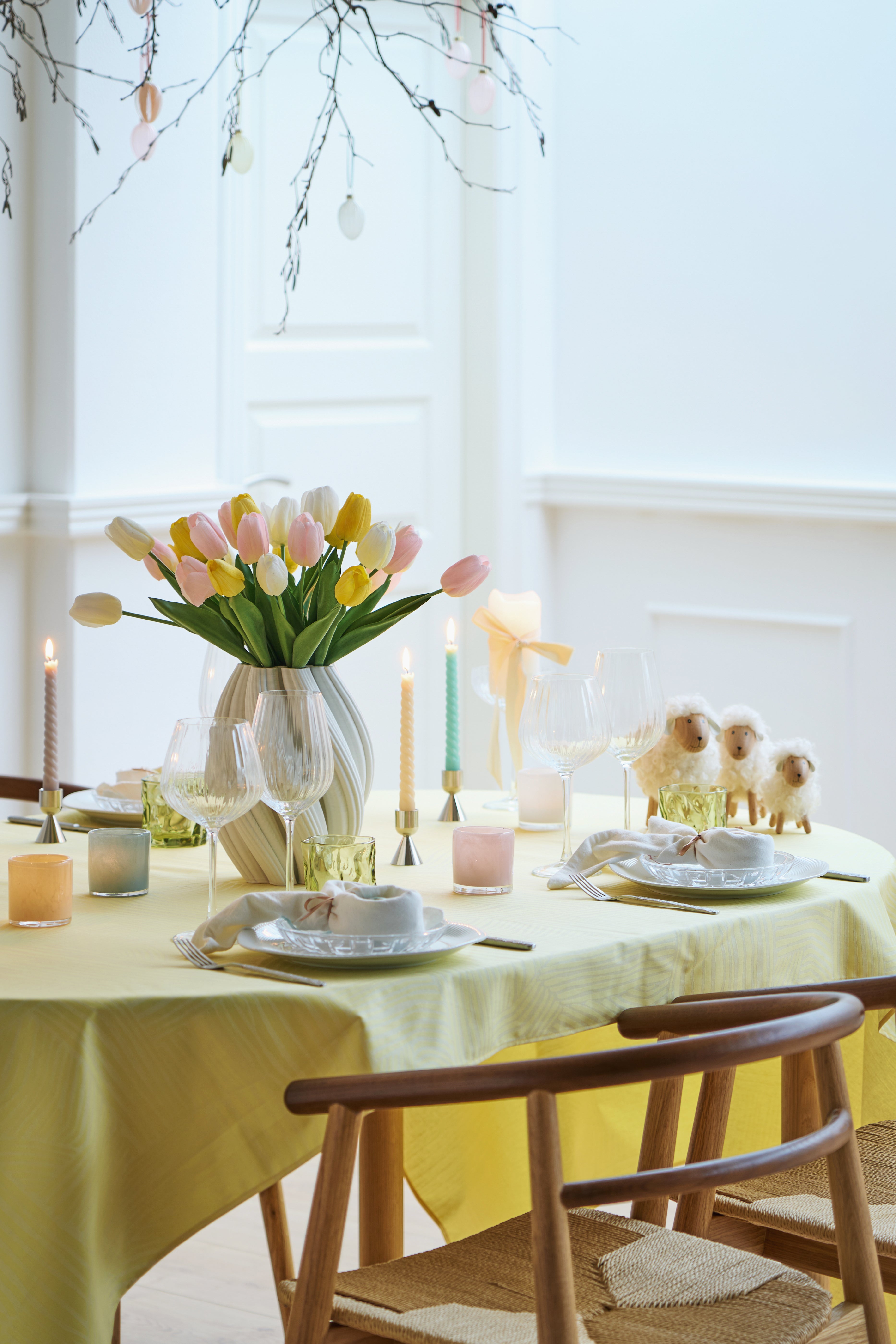 Et bord fyldt med forårsfarver, blomster og påskeinspiration. Ideelt til påskefrokoster, hvor kreativitet og hygge går hånd i hånd.