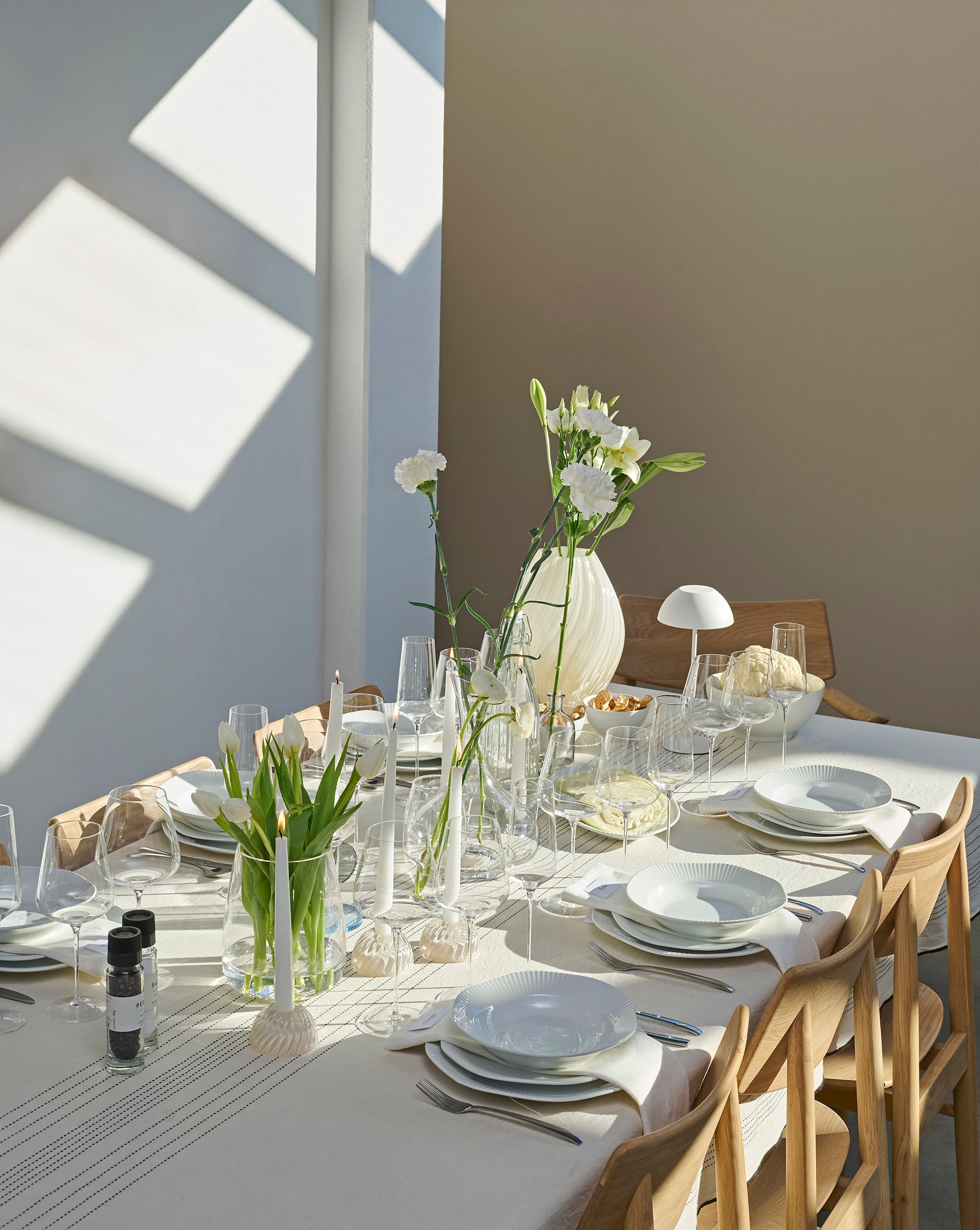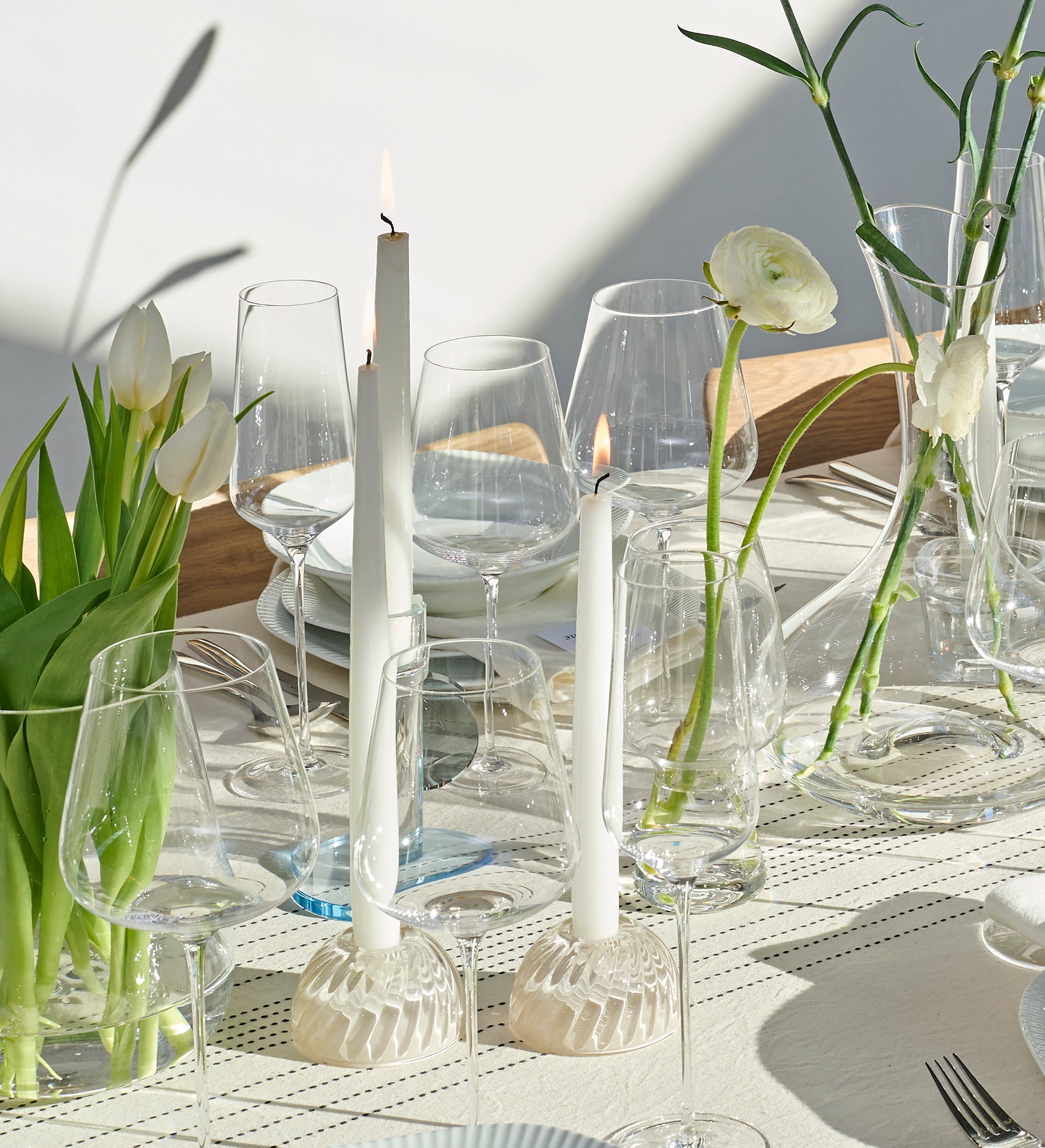 Tip! Mix og match lysestager, vaser og blomster for et personligt udtryk. Skab en smuk helhed med sæsonens blomster i dæmpede nuancer eller friske pasteller.