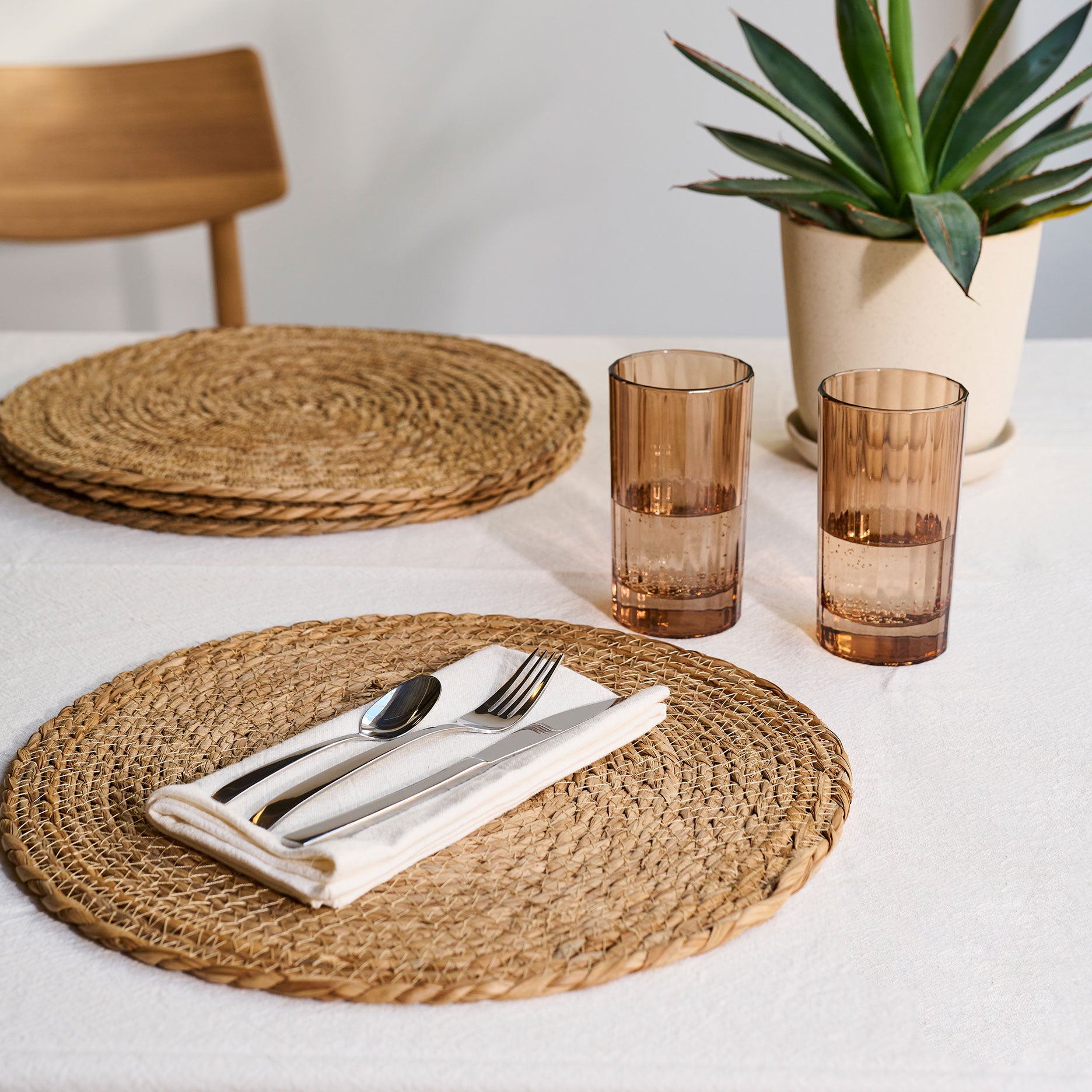 Tip! Kombinér klassiske hvide tallerkener med farvede glas og naturlige materialer for et moderne look.