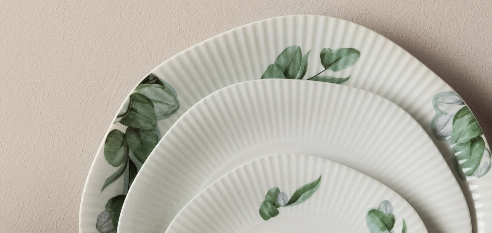 Magic Garden-stellet er fremstillet i hvidt porcelæn og prydet med smukke eucalyptusblade. Eucalyptus symboliserer friskhed og ro, og de elegante, printede blade tilføjer et naturligt touch til din borddækning. De grønne blade står i flot kontrast til det rene, hvide porcelæn, hvilket giver hvert stykke en unik og naturlig skønhed. Magic Garden-stellet er ideelt til både hverdagsbrug og særlige lejligheder, hvor du ønsker at tilføje et strejf af natur og elegance til din borddækning. Kombiner med andre dele fra Magic-serien for et personligt og harmonisk udtryk, der imponerer dine gæster og forvandler enhver spiseoplevelse.
