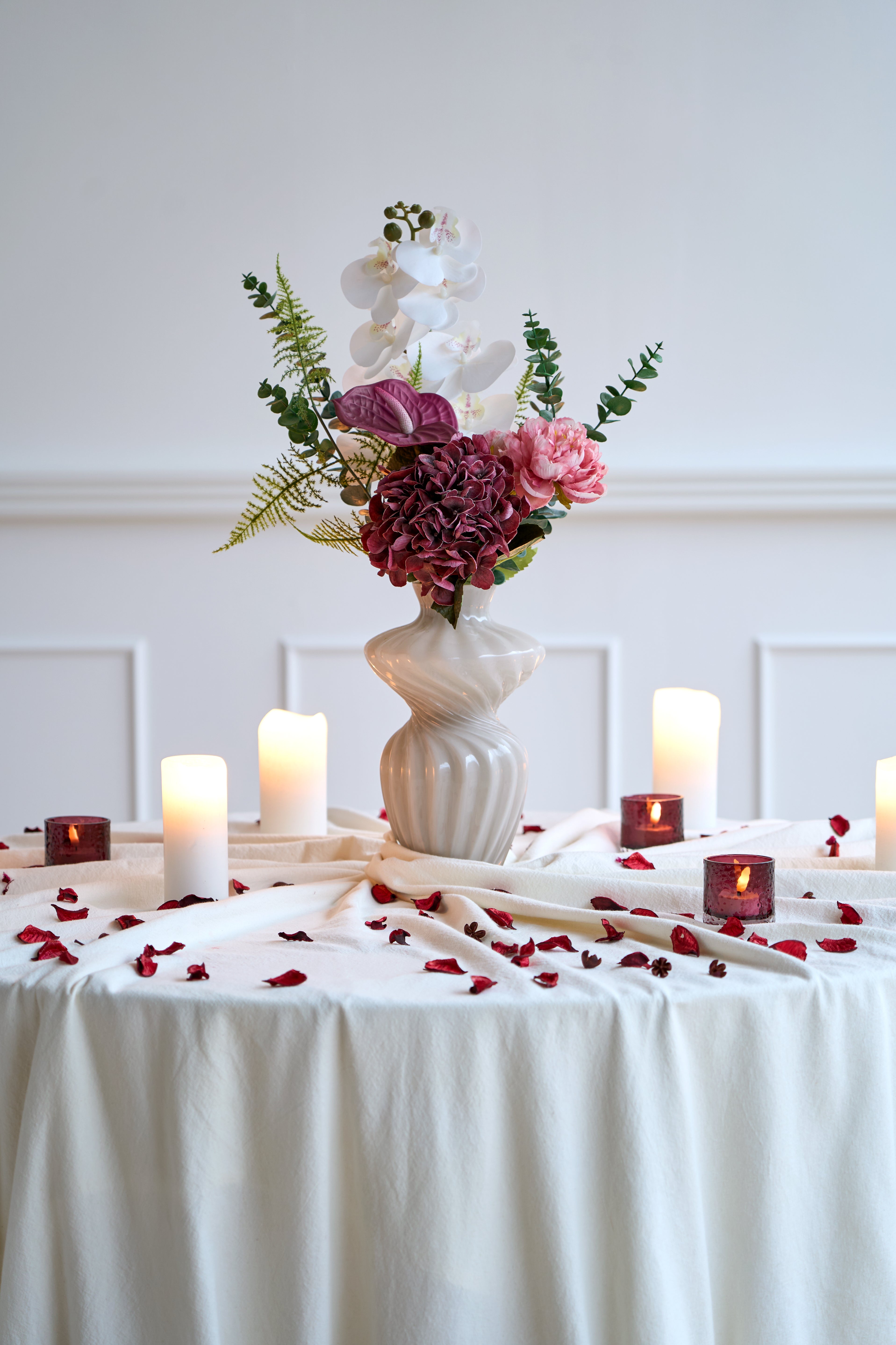 Tip! Mix og match lysestager, vaser og blomster for et personligt udtryk.