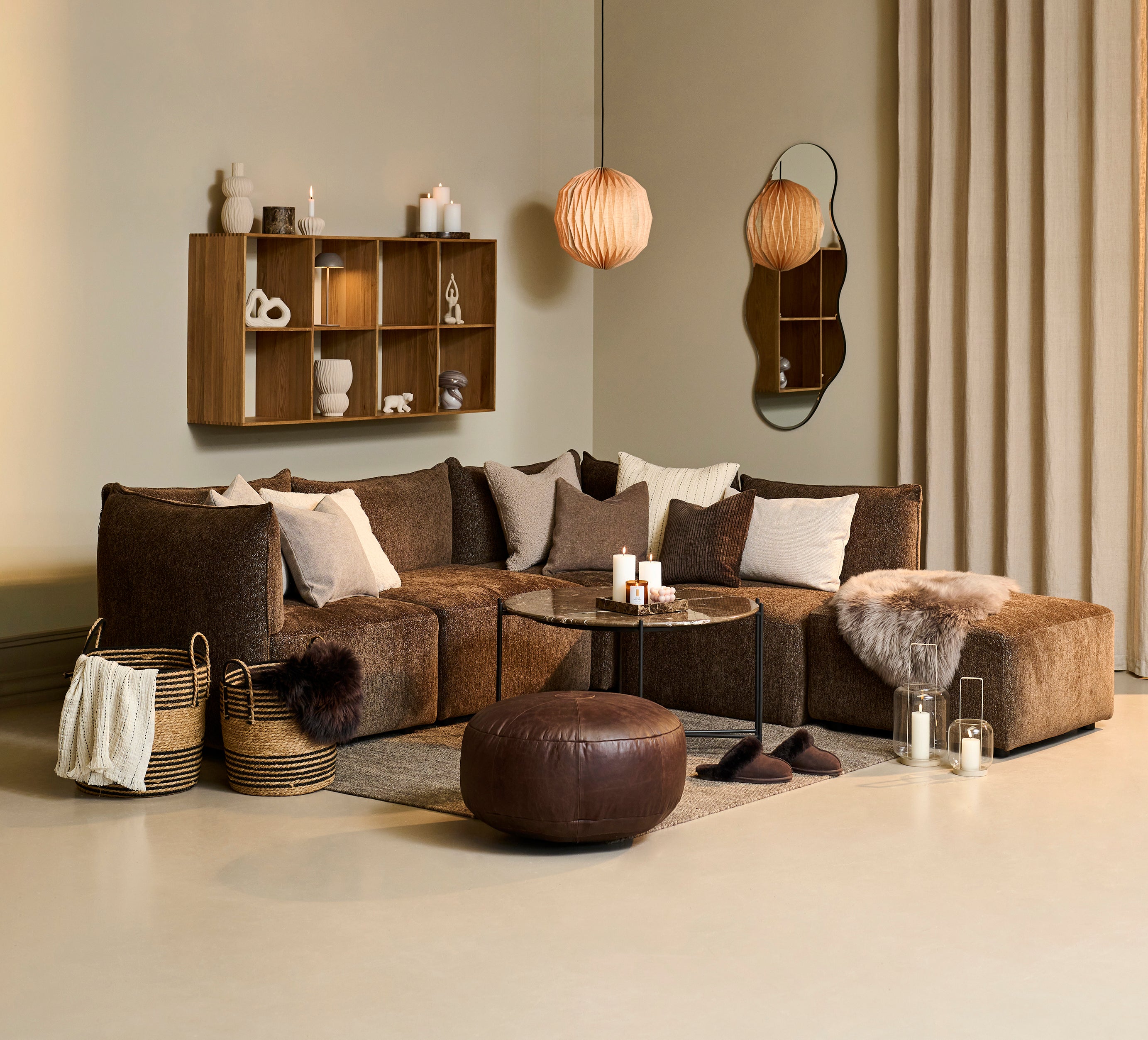 Oplev den ultimative komfort og hygge med vores eksklusive udvalg af produkter, der forvandler dit hjem til et afslapningsparadis. Vores bløde puder og plaider skaber den perfekte atmosfære for en afslappende aften. Tilføj varme og charme med stilfulde lanterner, og oplev luksus med vores lammeskind. Kompletter dit rum med elegante borde, en indbydende sofa og en alsidig puf, der giver dig mulighed for at genoplade og nyde hver eneste stund.