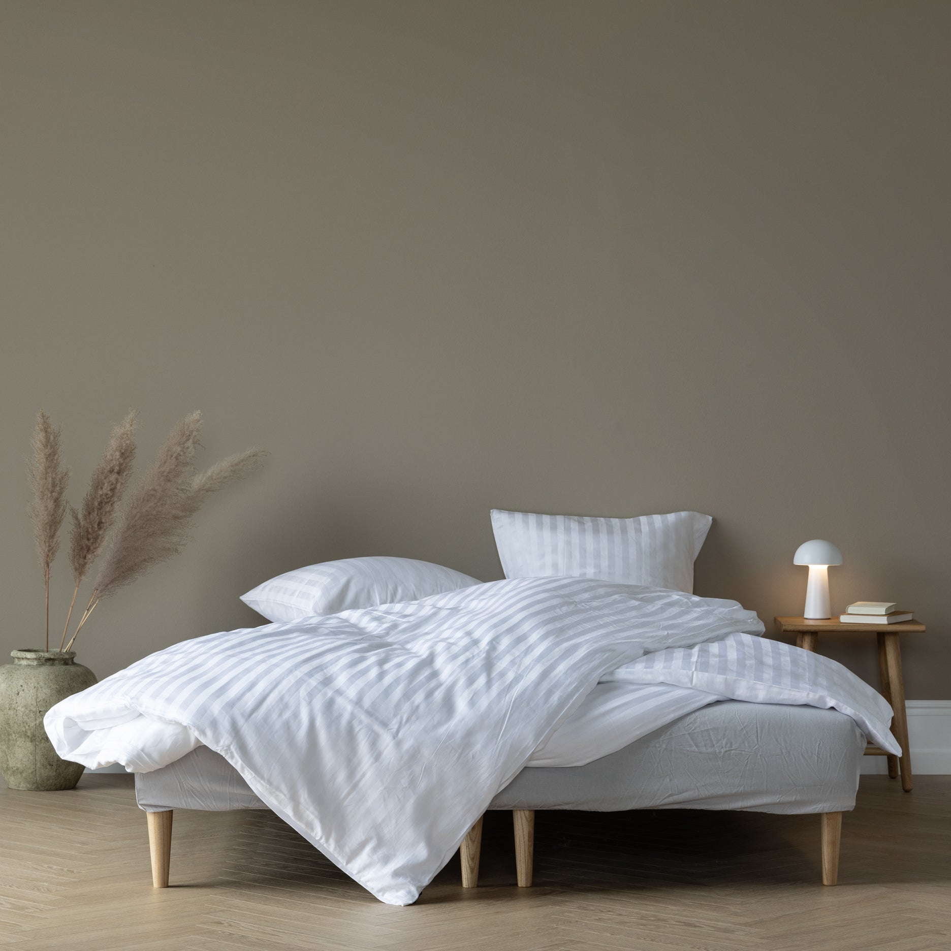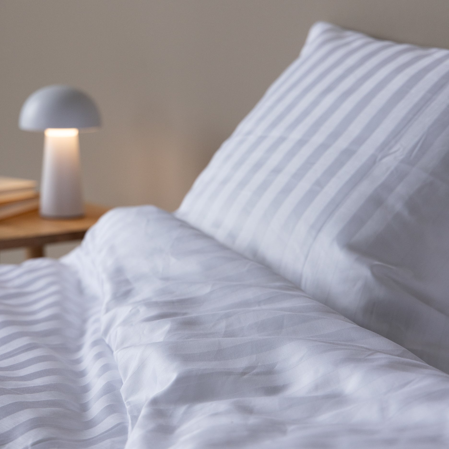Stripe sengetøjet er fremstillet af 100% OEKO-TEX bomuld (foruden lynlås) og er jacquard vævet af fine garner, hvor vævningen er af bomuldssatin. Dette er med til, at give en eksklusiv, blød og behagelig overflade, som er yderst holdbar. Der er skjulte YKK lynlåse i både pude- og dynebetræk. Stripe sengetøjet fås i mange skønne farver.