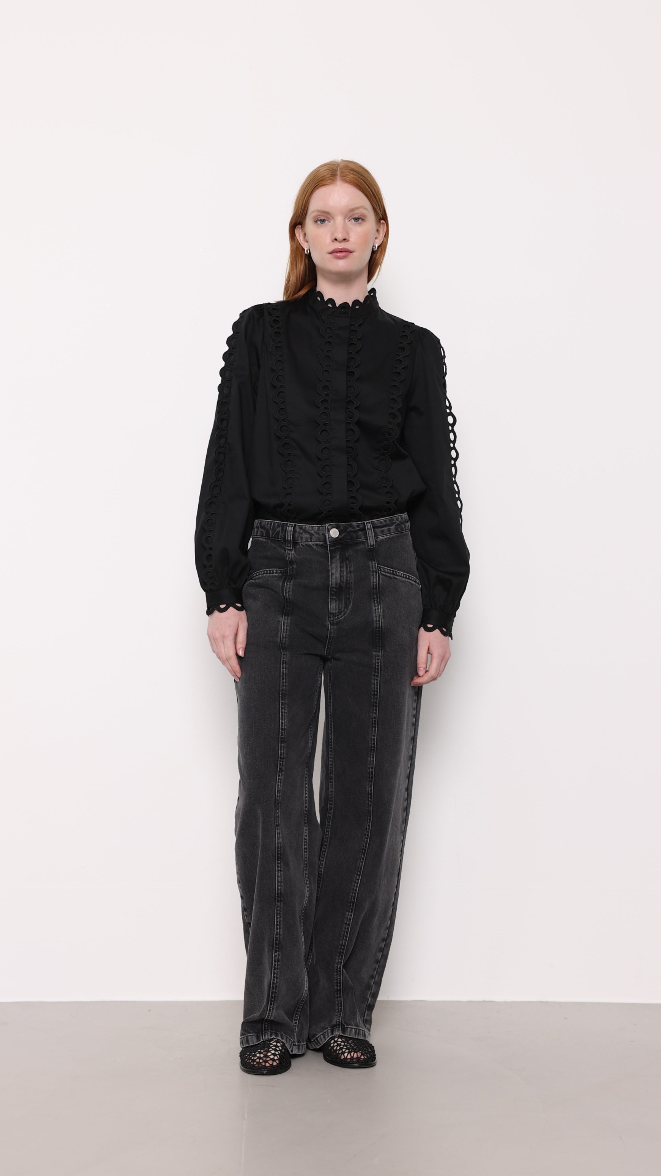 - Broderi anglaise detaljer langs knapstolpe, krave og ydersiden af ærmerne.