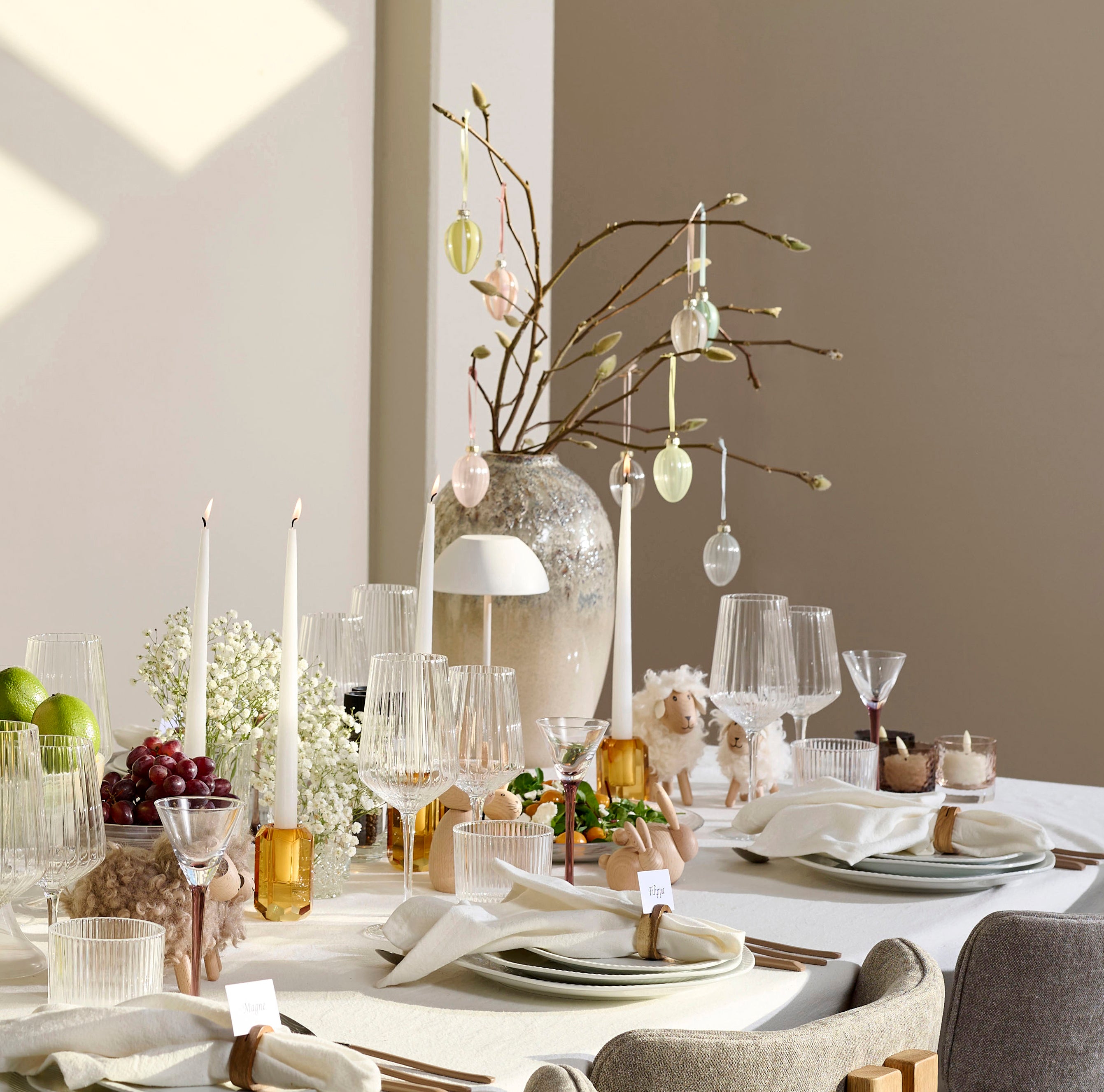For en elegant påskeborddekoration kan du arrangere yndefulde grene i en vase og lade de farverige æg hænge som små kunstværker. Vælg en vase fra vores forårskollektion, som afspejler de fine detaljer i æggene. For at skabe en glad og naturlig stemning kan du tilføje små trækaninfigurer eller vores søde små får.